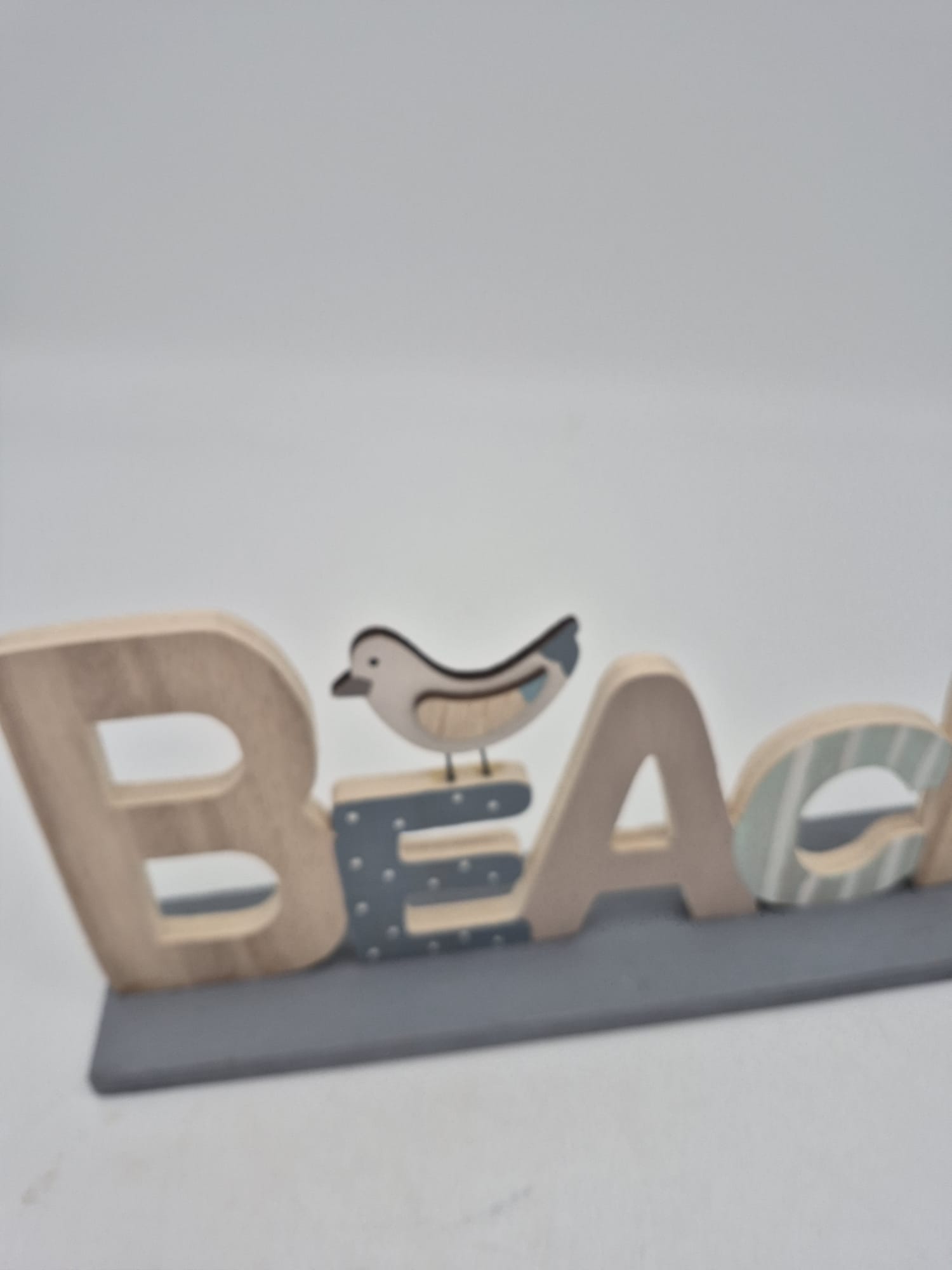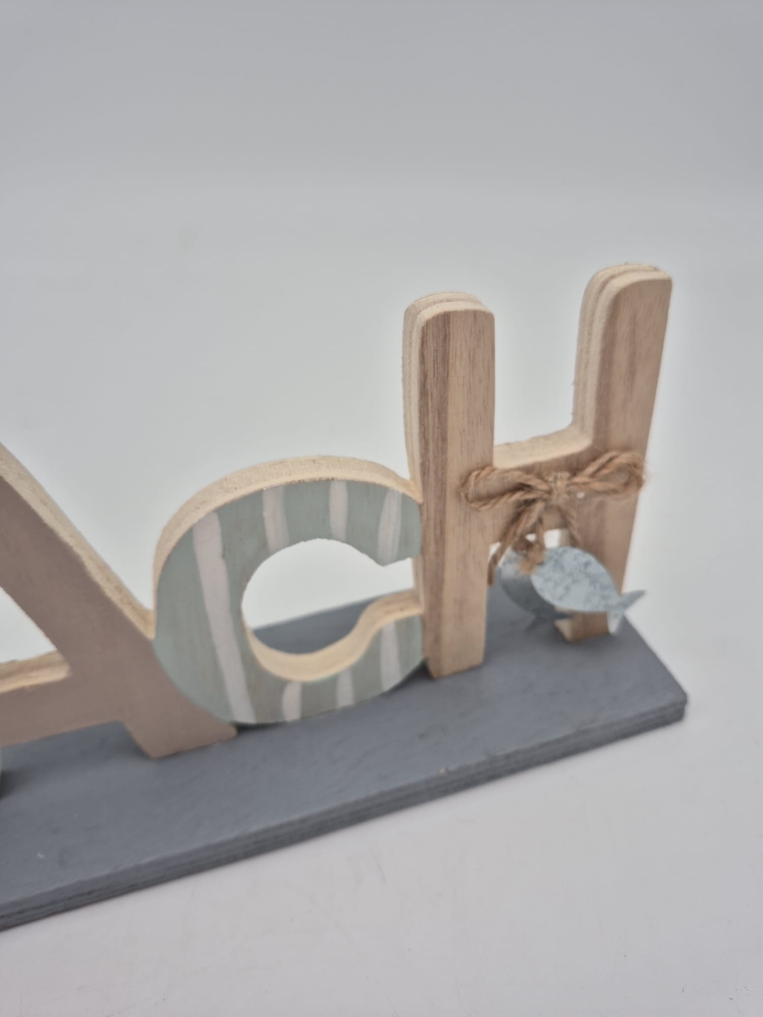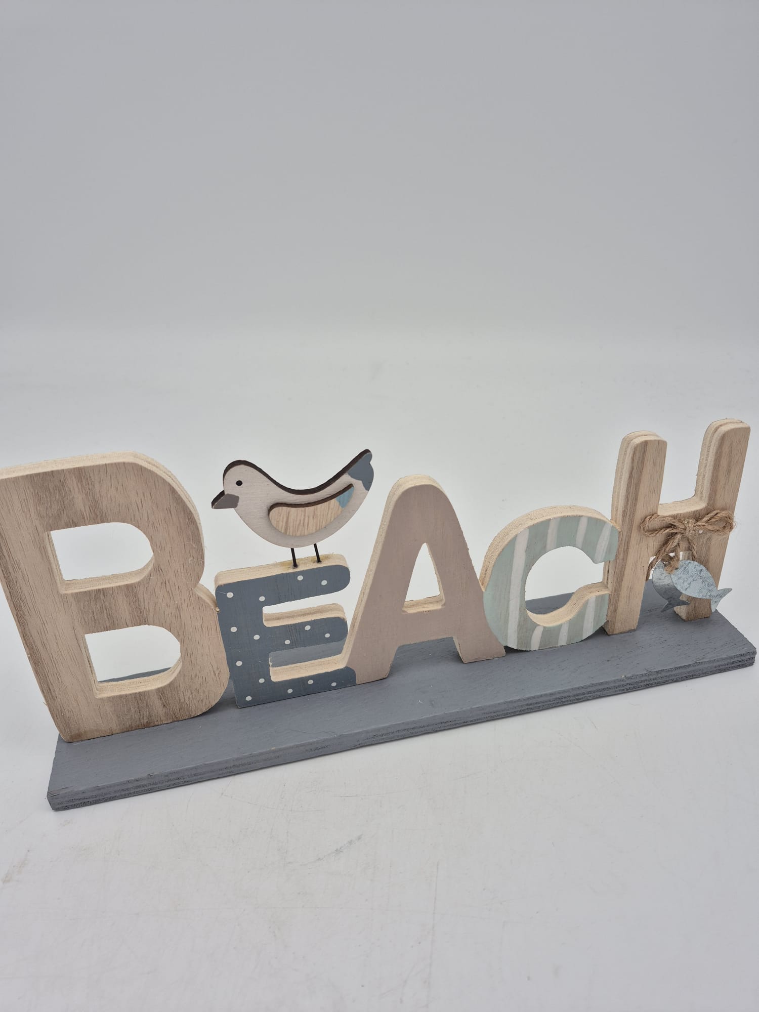 Dieser liebevoll gestaltete Holzschriftzug „BEACH“ bringt sofort Urlaubsfeeling in jeden Raum. Die verschiedenen Buchstaben sind in sanften, maritimen Farben gehalten und mit niedlichen Details verziert – darunter ein kleiner Vogel sowie ein dekorativer Fischanhänger aus Metall.