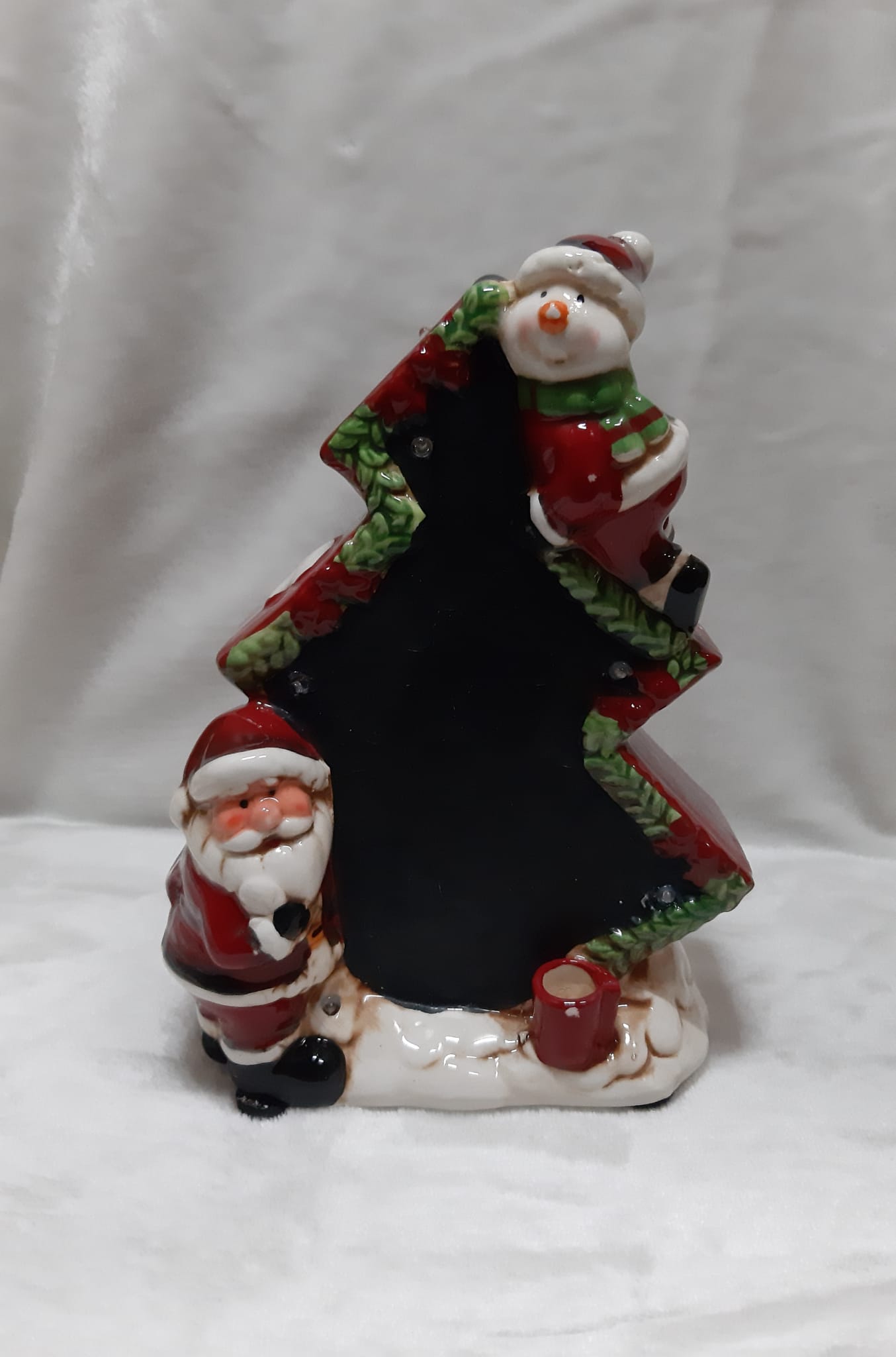 Diese liebevoll gestaltete Weihnachtsfigur vereint gleich mehrere Highlights in einem dekorativen Stück. Die Keramikfigur zeigt einen fröhlichen Santa und einen niedlichen Schneemann an einer großen Tannenbaumtafel – perfekt, um kleine Botschaften, Grüße oder tägliche Weihnachtscountdowns mit Kreide zu notieren.