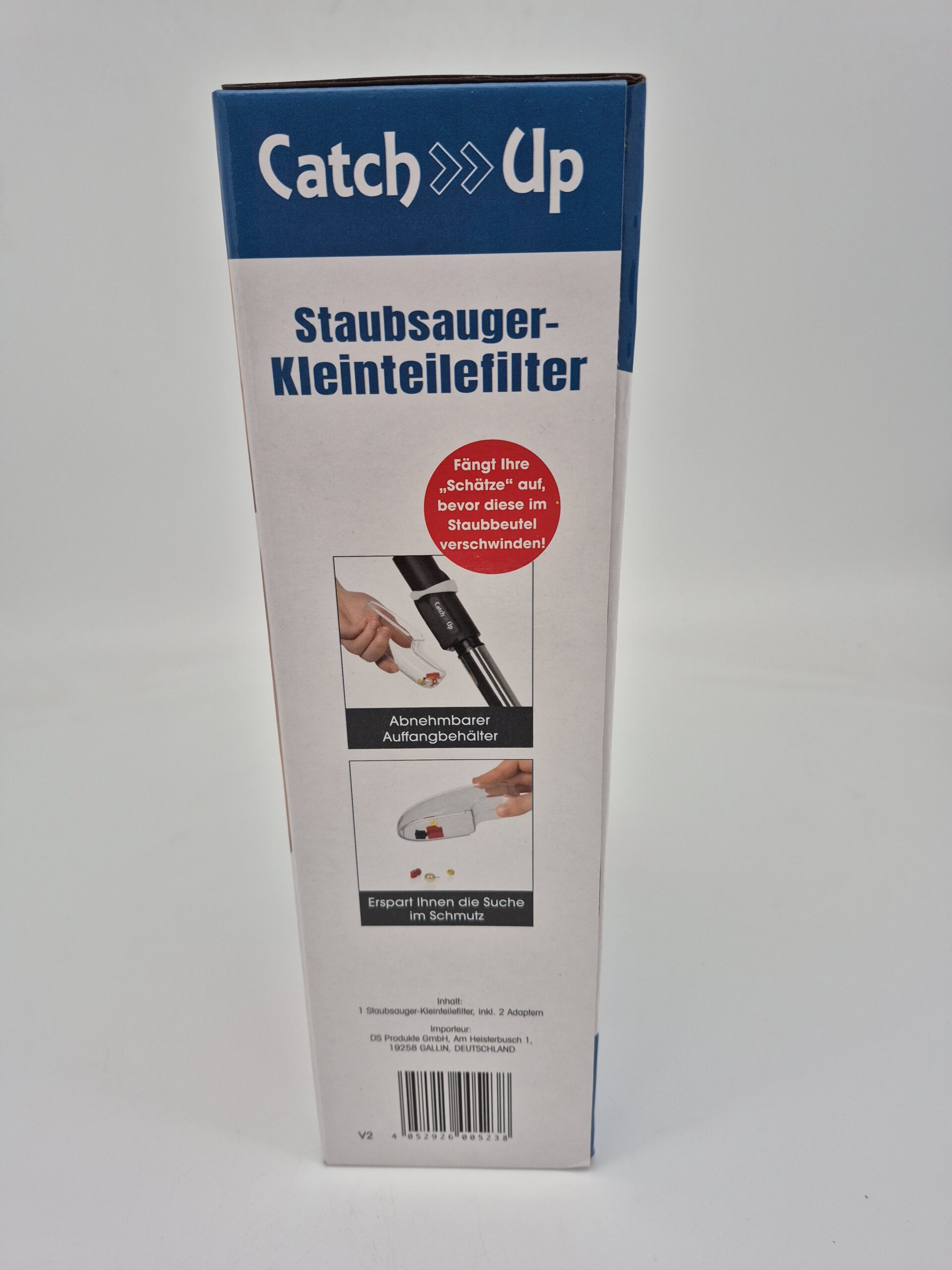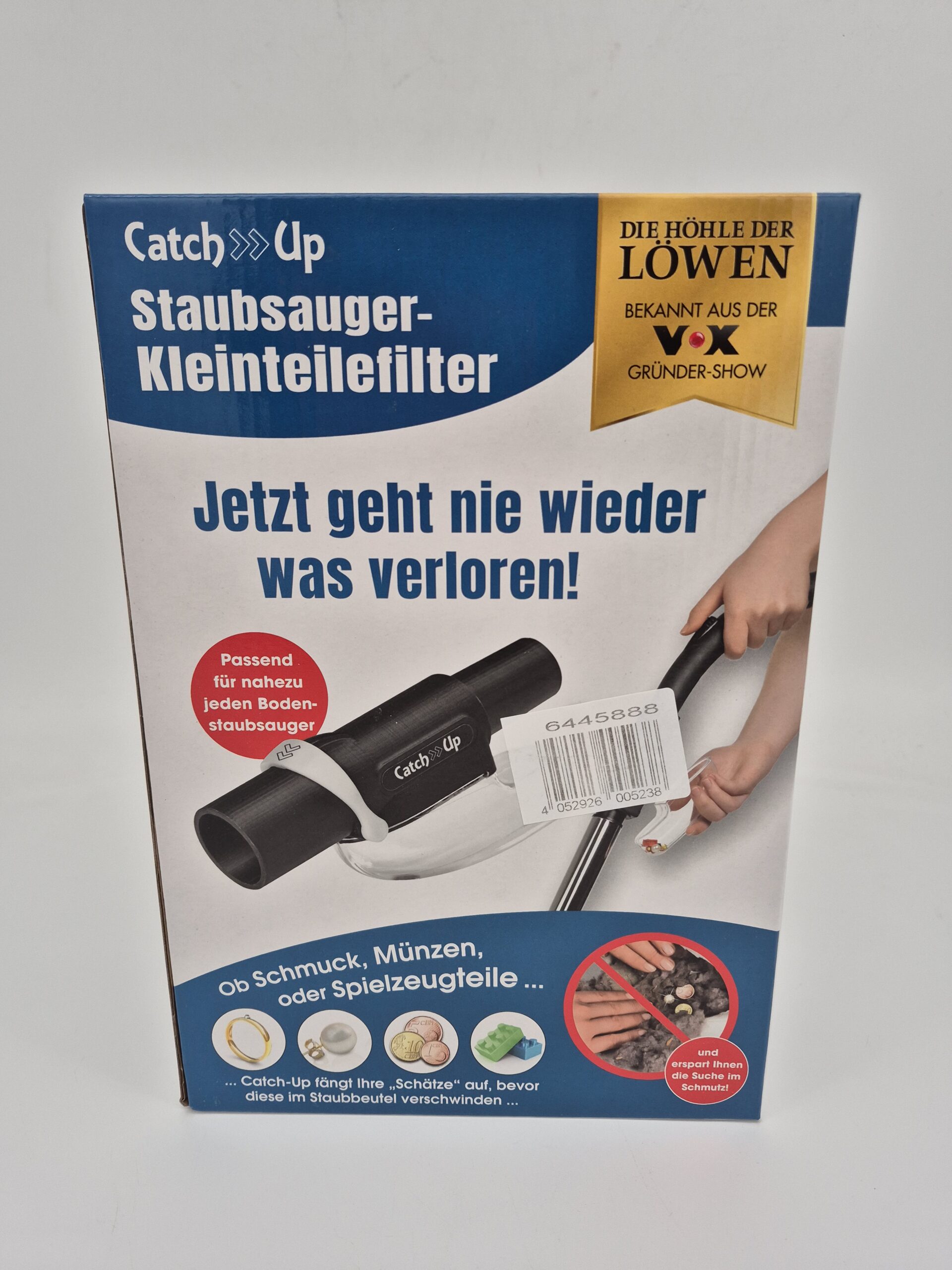 Mit dem Catch Up Staubsauger-Kleinteilefilter gehören verlorene „Schätze“ im Staubsaugerbeutel der Vergangenheit an. Ob Schmuck, Münzen, Lego-Steine oder kleine Spielzeugteile – der innovative Vorsatzfilter fängt Kleinteile zuverlässig auf, bevor sie im Staubsaugerbeutel verschwinden.