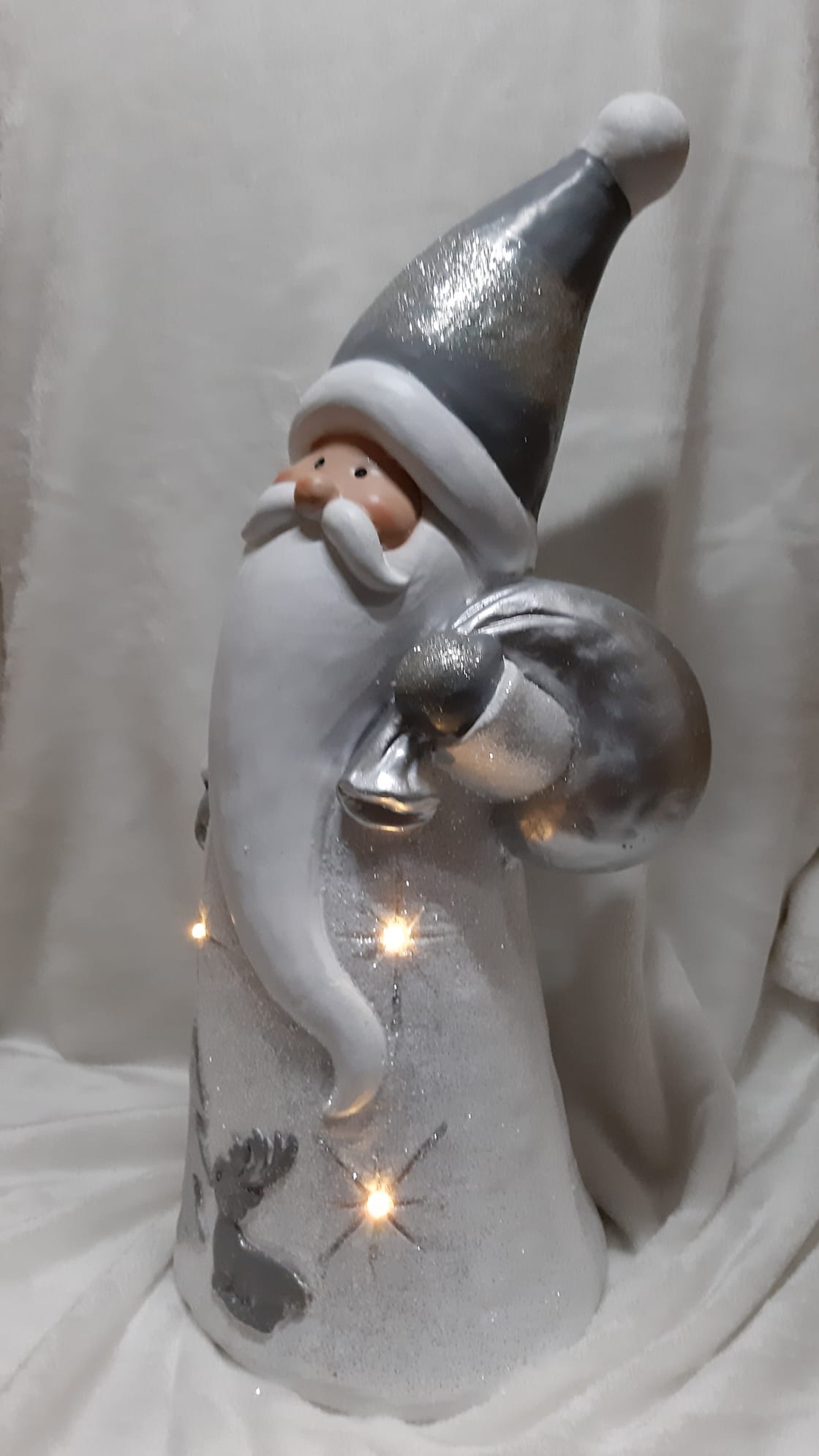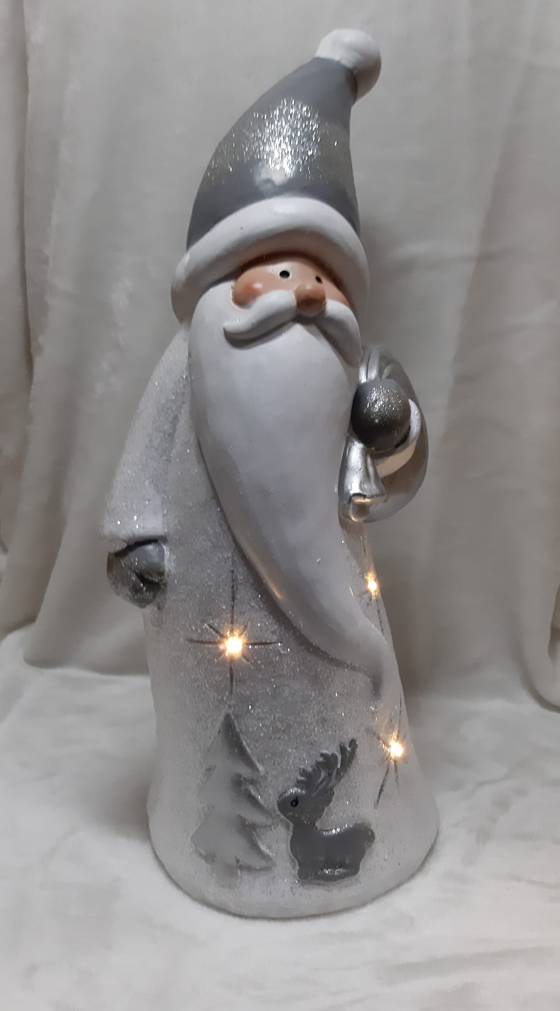 Diese stilvolle Weihnachtsfigur bringt eleganten Glanz in jede Winterdekoration. Der edel gestaltete Santa in Silber- und Weißtönen besticht durch seine harmonische Form, dezente Glitzerakzente und liebevolle Details wie den kleinen Tannenbaum und das Rentier am Fuß der Figur.