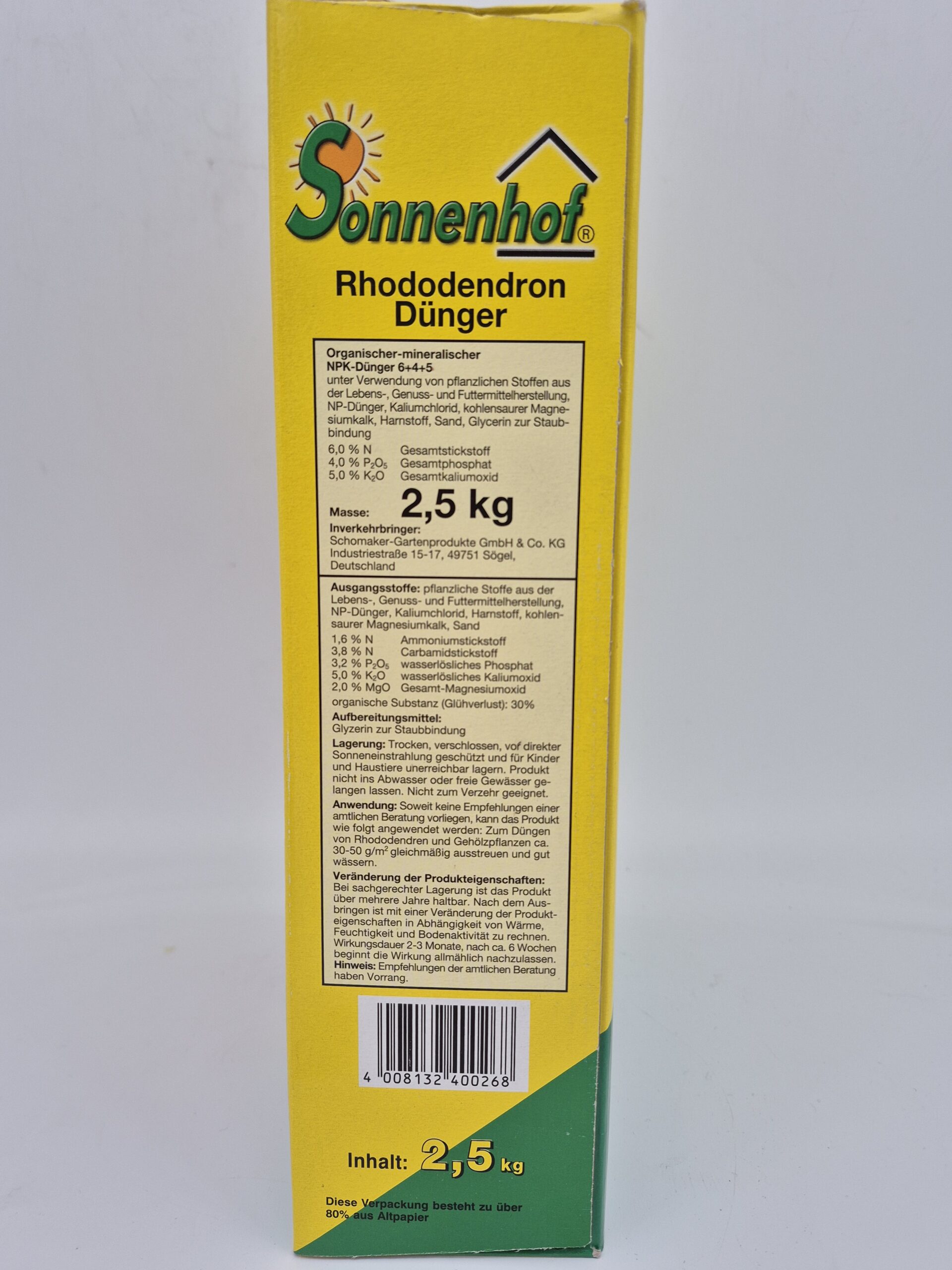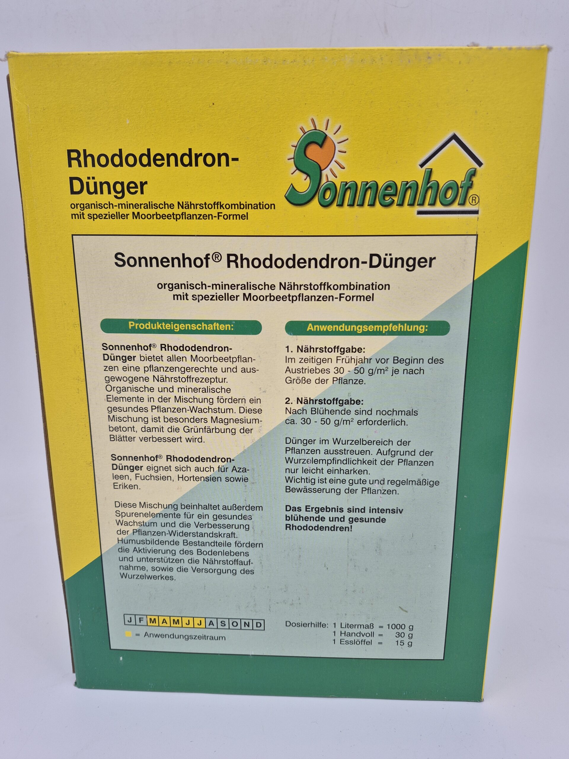 Der Sonnenhof® Rhododendron-Dünger ist ein hochwertiger organisch-mineralischer Spezialdünger für Rhododendren, Azaleen und andere Moorbeetpflanzen. Die ausgewogene NPK-Formel 6-4-5 mit zusätzlichem Magnesium sorgt für kräftiges Wachstum, sattgrüne Blätter und eine üppige, langanhaltende Blütenpracht.
